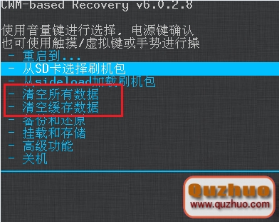 2、首先我們對手機進行刷機前的必備操作,雙清(清空所有數據和清空緩存數據),使用音量鍵選擇,電源鍵確認。