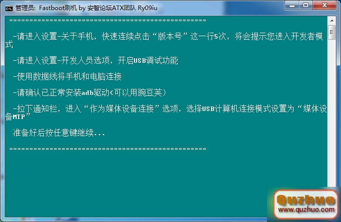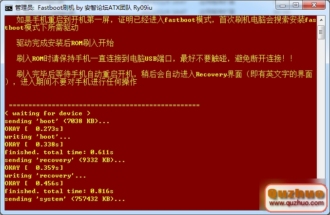 3、一切就緒後按任意鍵開始進行刷機,手機進入Fastboot模式,等待驅動自動安裝完成後進行刷機。如圖: