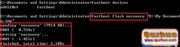 5.輸入fastboot flash recovery 文件。recovery後加空格並將工具中的recovery.img拖動至窗口中,此時會出現文件路徑。並回車,等待完成即可。