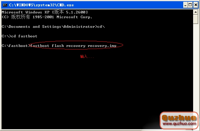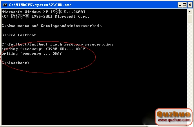 2、然後我們將手機進入fastboot模式(可通過刷機精靈一鍵進入)手機通過數據線連接到 電腦!在命令窗口輸入【fastboot flash recovery recovery.img】按回車,等待窗口返回數據。