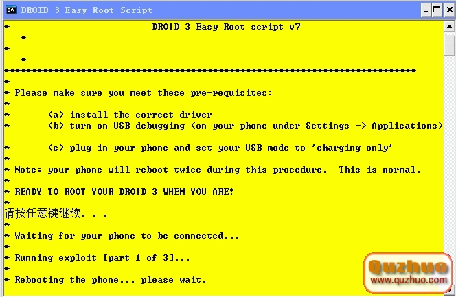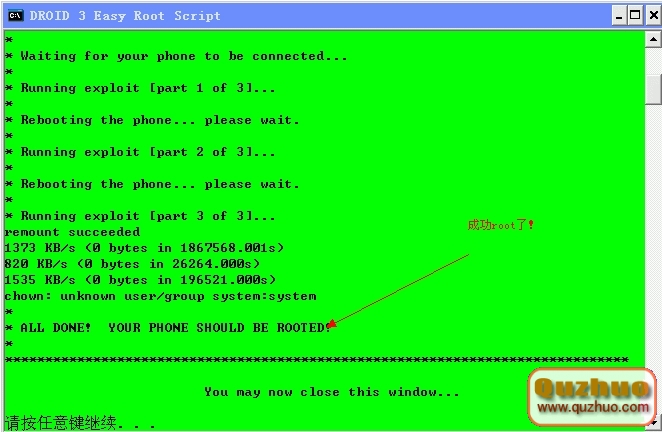 將你下載下來的文件解壓,下載droid_3_easy_root_script_v7.zip,解壓之後,雙擊裡邊的 bat 文件,即可成功ROOT,如上圖:
