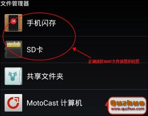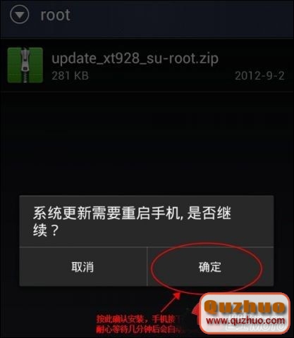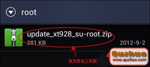1) 使用摩托羅拉XT928自帶的“文件管理”找到update_xt928_su-root.zip 之後,長按:
