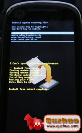 6.下面看到的界面就是一個選擇的界面了,使用音量鍵進行選擇,用搜索鍵進行確認,這時候用戶需要找到applysdcard:update.zip。稍等片刻之後,再次選擇手機裡面的rebootsystemnow。重新啟動手機,這樣摩托羅拉xt800ROOT教程就完成了。