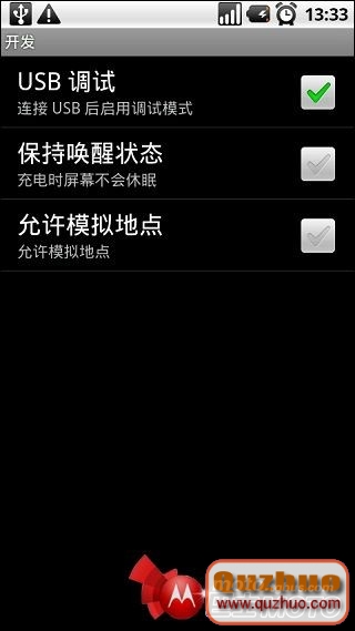 2.對摩托羅拉xt800手機的USB進行調試,首先是打開主菜單,然後進入手機的設置,應用程序,開發,最後在USB調試前面打鉤。