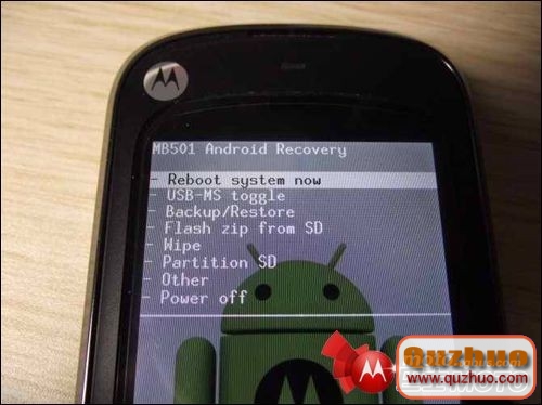 3.這時候,在摁下手機上面的音量【—】,大概五秒之後,摩托羅拉ME501就會直接進入recovery界面,recovery界面如下圖: