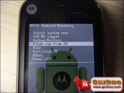 5.返回到菜單選項之後,就選擇flash zip from SD,確認之後,就會進入到下一界面,選擇摩托羅拉ME501要進行刷機的ROM包,最後在摁下房子鍵連續兩次,接下來就是靜靜的等待。摩托羅拉ME501刷機完成之後,手機界面會自動但會主菜單,這時候摁下房子鍵,手機會自動重啟。