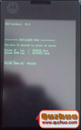 3、將SD卡放入手機,在手機關機狀態下,同時按住右側的電源鍵(就是開機鍵)和拍照鍵不放,直到手機屏幕上出現一行綠色英文畫面時再放手,放手後如圖: