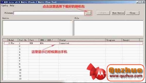 然後手機關機好之後,一只手按住電源鍵,一只手按住音量上鍵,然後屏幕閃一下就可以放手了,接下來用數據線和www.shuleba.com電腦連接上,打開下載好的RSD,這時看下面對比圖,我就525的刷低包圖給您對比一下,525和525+刷法一樣的!
