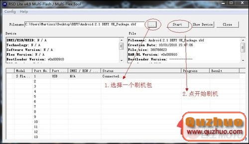 4:選擇已下載好的刷機包 DEFY_Android_2.1_UK_2.51.1_With_2.21.0_Boot 後點Start(如下圖)