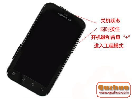 首先,讓手機進入Bootloader工程模式,戴妃me525進入工程模式的方法是同時按住開機鍵+音量鍵上,按住不放稍等幾秒就可以了。