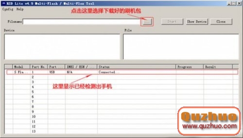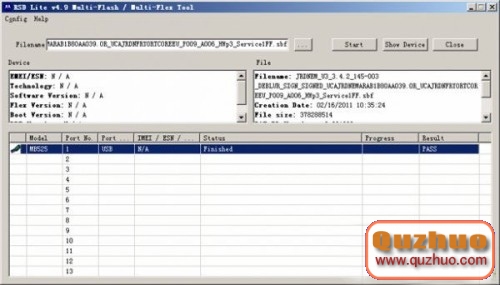這個時候再運行www.shuleba.com電腦上已經安裝好的RSD刷機工具,在RSD工具下方就會顯示出檢測到的手機信息了。...選項是選擇刷機包和底包的,下方的狀態欄顯示了手機的各種狀態,另外提醒大家,從狀態欄想必大家也可以看出來,RSD是支持多機同刷的,也就是說多台手機可以再www.shuleba.com電腦上同時刷一個包。