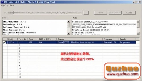 點擊開始刷機之後,RSD軟件就會自動幫您刷入您要刷的底包了,後面刷ROM包也是一樣的步驟和原理,刷機過程中需要耐心等待,後面的狀態欄會依次讀條四次。