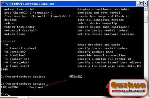 c、 在www.shuleba.com電腦左下角開始菜單中,運行框裡面輸入cmd命令,按Enter打開cmd界面,在cmd框裡面輸入moto-fastboot然後按回車鍵,可以看到提示命令;輸入 moto-fastboot 回車,可以看到你的設備。