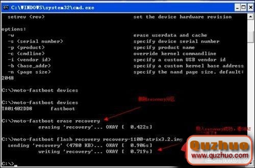 例如 moto-fastboot erase recovery 是清除recovery分區,這個可以很干淨的刷入另外的recovery。