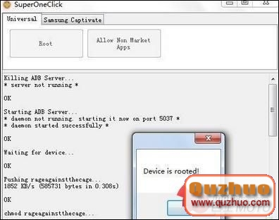 執行OK之後,會彈出一個窗口,Device is rooted,好了,這個是胡就大功告成了,關閉root工具,拔出數據線,看看您的me722 root權限是不是已經獲取了呢?
