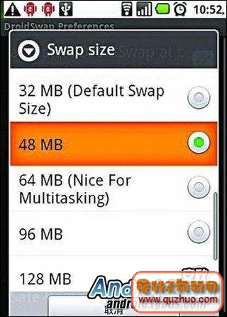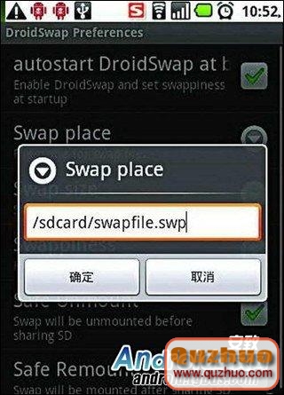 DroidSwap的使用方法與“一鍵省電”類似,都是只需按一下按鈕即可看到效果,不過在使用前需要簡單設置:安裝好該APK軟件後,按“Menu”鍵進入“Configuration”(配置),在下拉菜單中選擇“Swap place”選項,為新分區起個好記的名字即可。