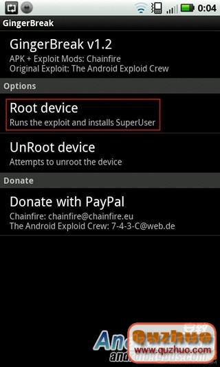 2.接下來安裝GingerBreak這款軟件,但不要安裝在SD/TF卡上。接著運行GingerBreak,點擊Rootdevice按鈕: