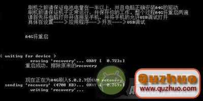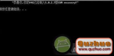 4、整個過程A4G將重啟兩遍,完成後會顯示 "恭喜你,你的A4G已經刷入5.0.2.7版CWM recovery!"