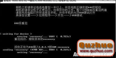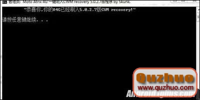 4、整個刷入過程中手機會重啟兩次,完成後,會提示你“恭喜你,你的A4G已經刷入5.0.2.7版CWM recovery”。