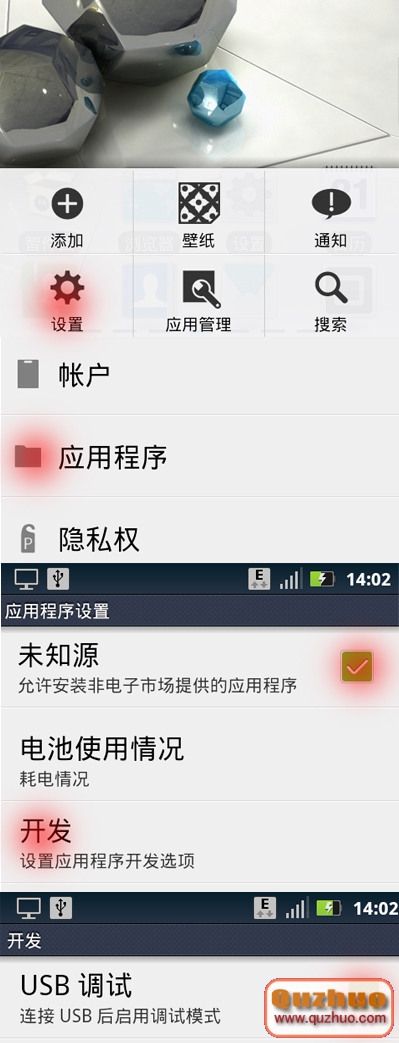 設置setting——應用程序applications開發Development——USB調試USB debugging √;