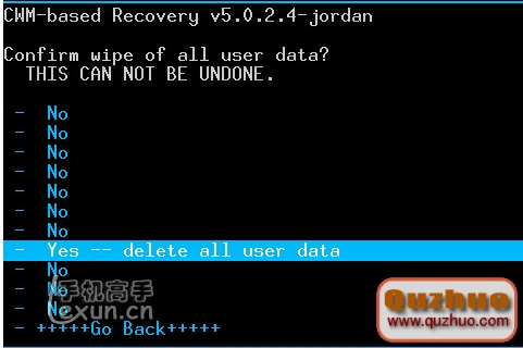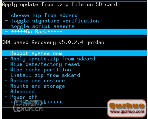 選擇Go Back回到Recovery根菜單,之後選擇reboot system now,並按電源鍵確認,手機會重啟 。