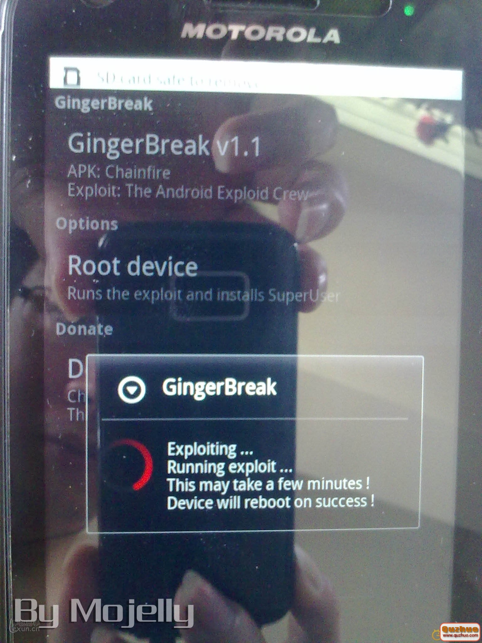 找到一張大小不限的TF卡插入手機的TF卡槽,要通過GingerBreak.apk獲取ROOT權限,