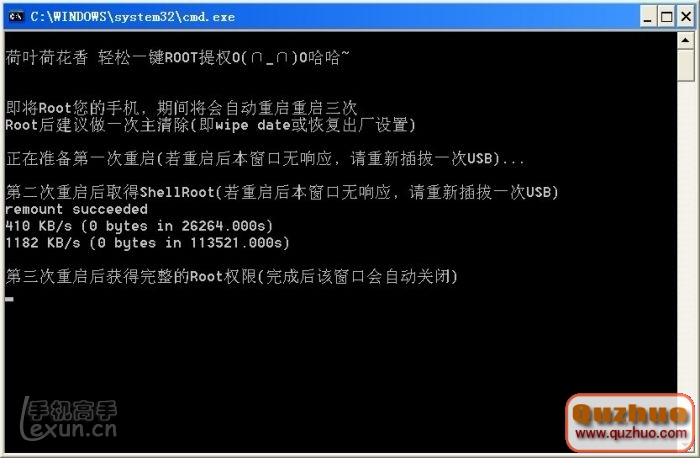 5、彈出的dos話框不要動 手機自動重啟三次後 對話框自動關閉