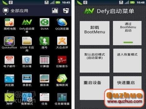 4、手機最後一次重啟完成之後進入菜單界面選擇“Defy啟動菜單”,期間會提示授權申請,