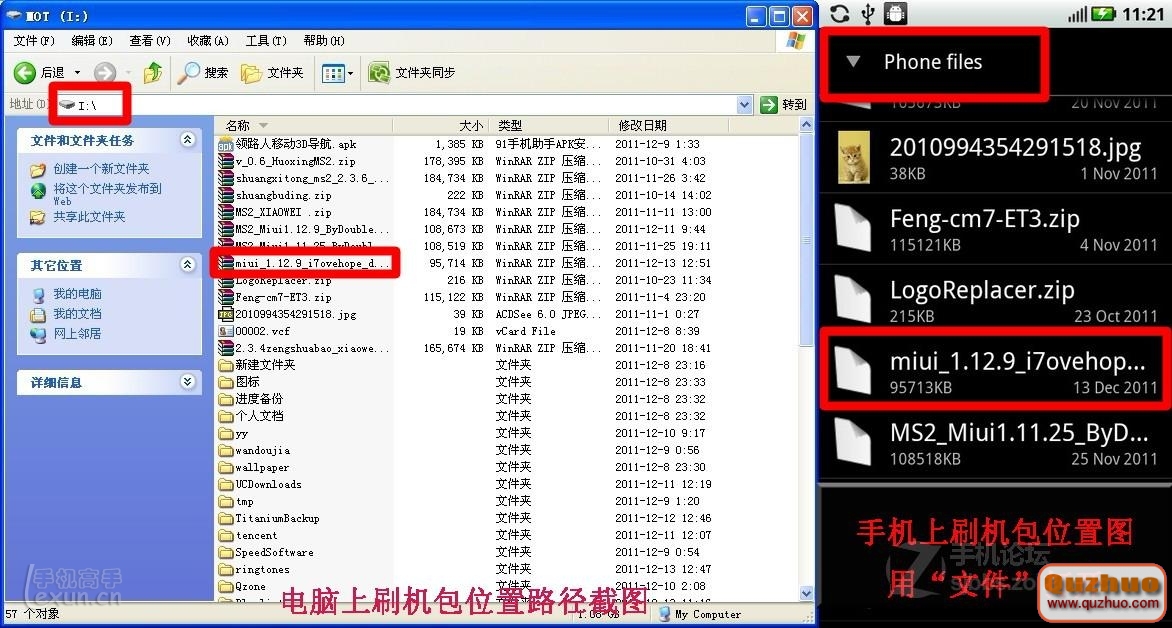 1、下載miui或者CM7刷機包(注意,是zip格式,不解壓的),並放於SD卡根目錄。如下圖所示: