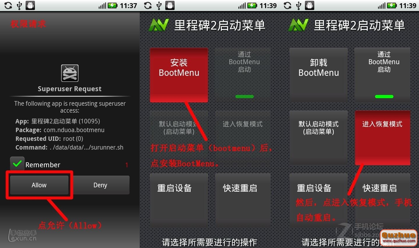 安裝bootmenu-A953.V.1.0.5.apk,並打開,提示授權時選擇允許,然後依次選擇安裝bootmenu和進入恢 復模式,如圖所示,隨後手機自動重啟。