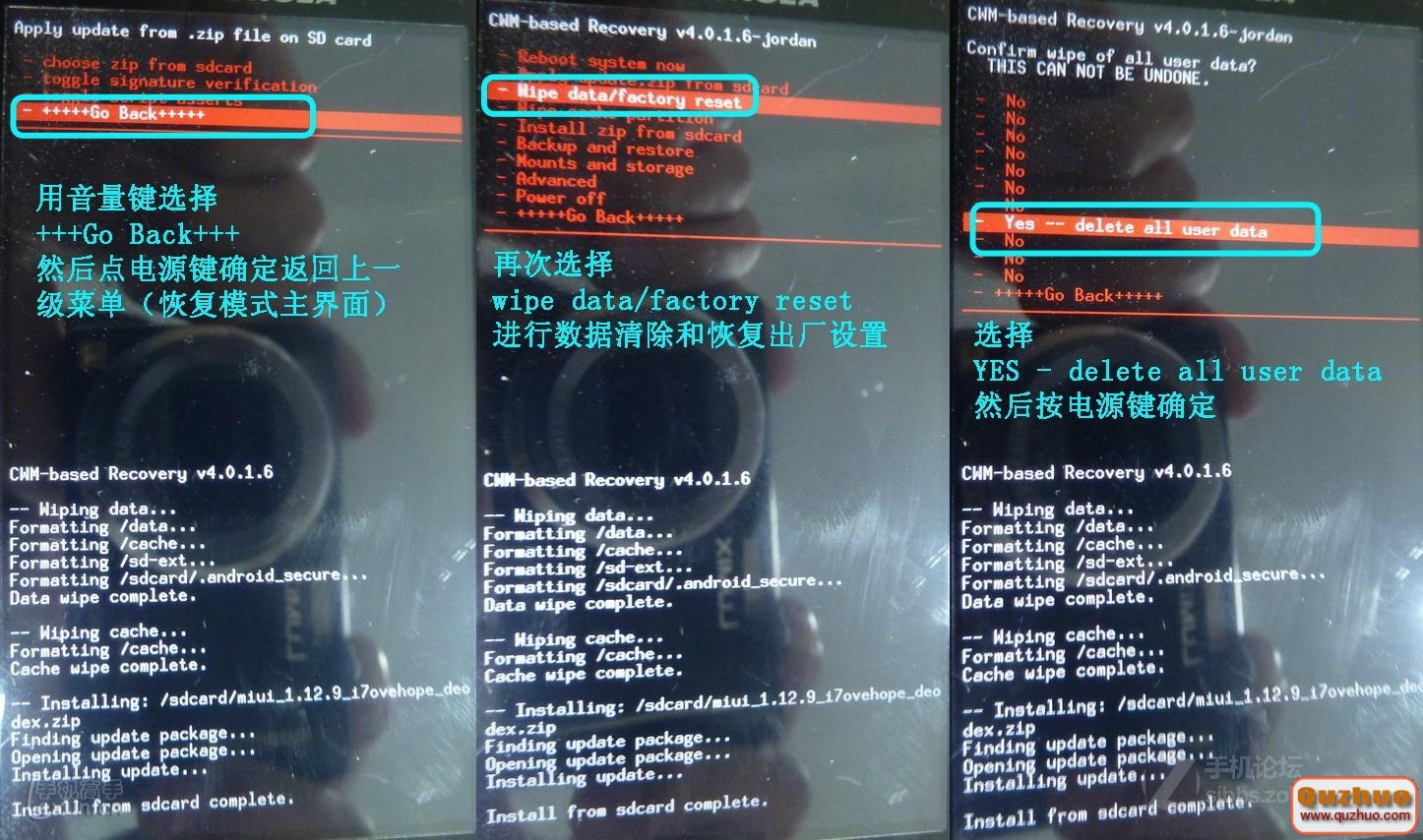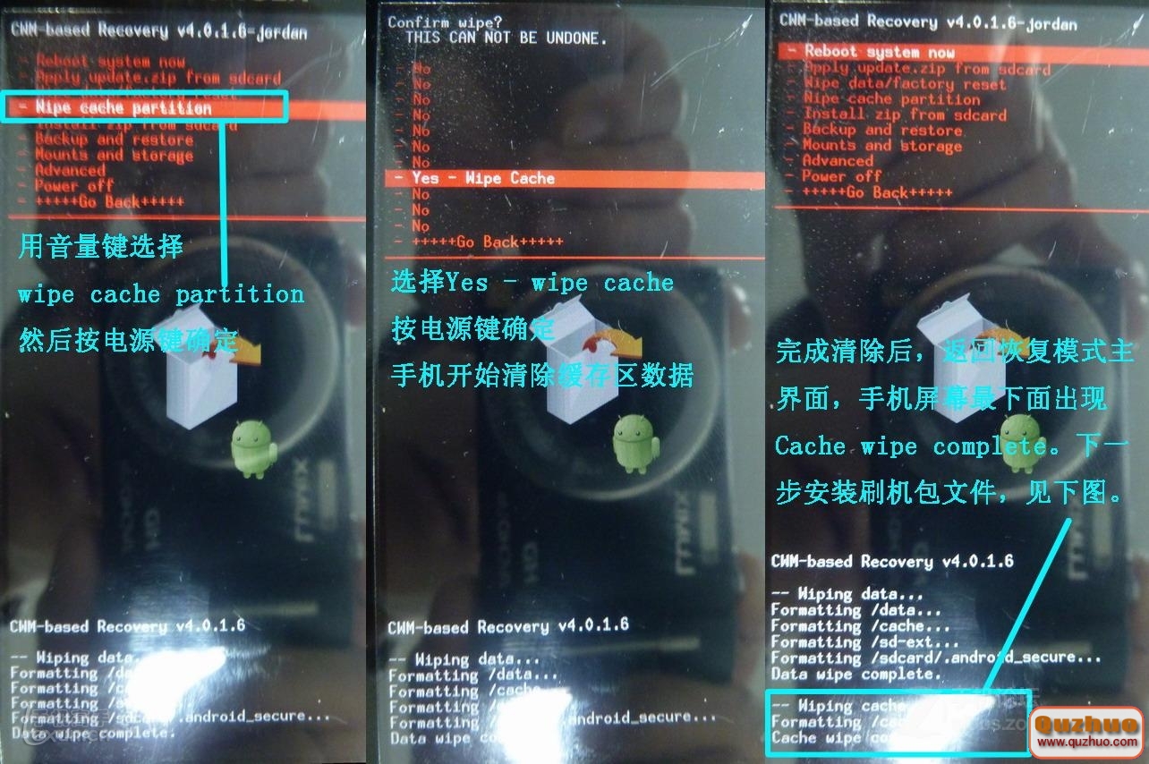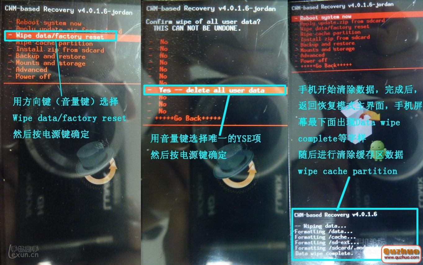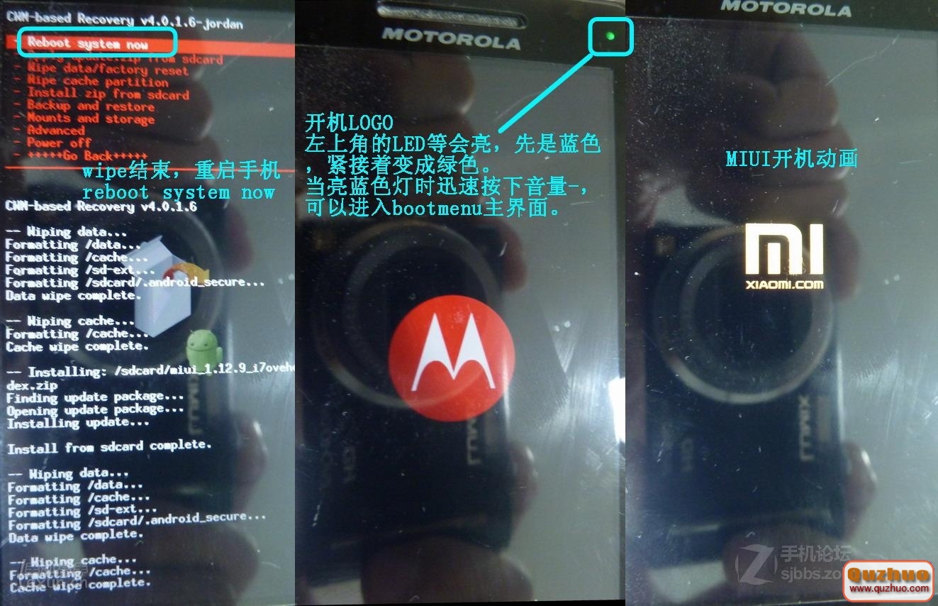 1、若bootmenu為1.0.5版,則直接重啟手機,在亮藍色LED燈時按音量-進入bootmenu,然後按上圖所示方法刷機。