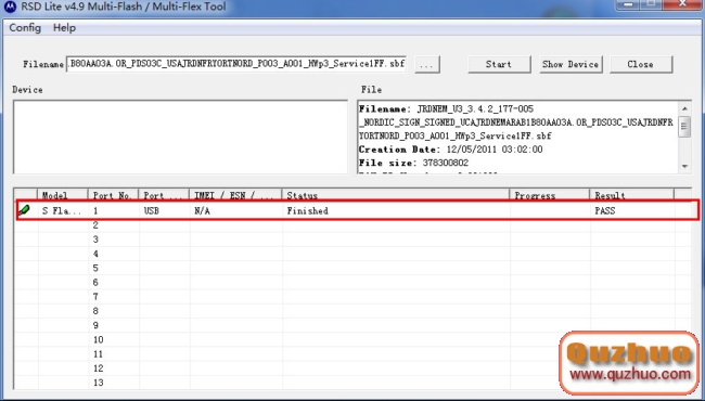 在桌面找到RSD圖標,運行後,點擊RSD Lite界面最上面的...按鈕,選擇下載好的“XT615XXXXX.sbf”文件,然後點Start開始刷機。