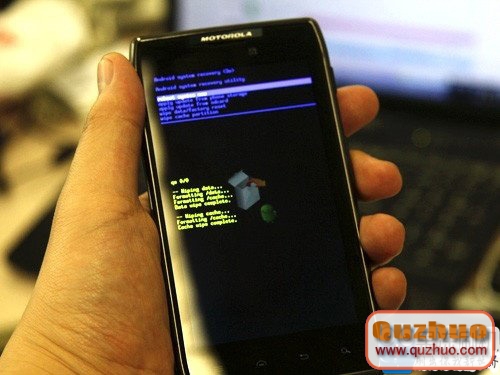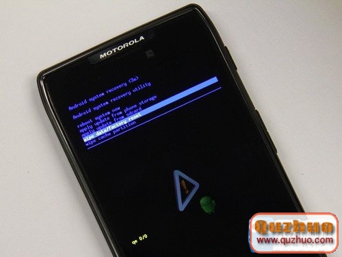 進入Recovery後,同時按住音量上下可以調出菜單。在Recovery中執行雙wipe,分別是wipe data/factory reset和wipe cache partition,wipe的操作使用音量鍵控制光標移動,使用開關機鍵確認。