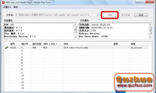 連接USB數據線手機連上正常RSD後就會有顯示(下側紅框),如果沒連接上,請檢查驅動程序。點擊“...”選擇剛才解壓的壓縮包,找到default_flash.xml這個文件,點擊開