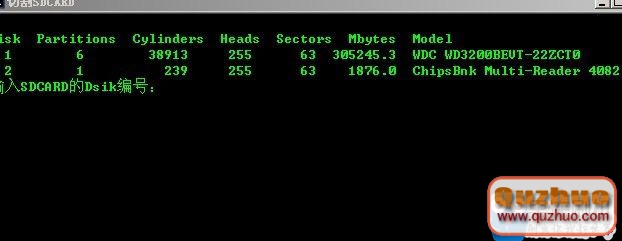 3.圖中只是范例,一定要依實際狀況輸入Disk編號,怎麼看DISK編號?先看後面卡的容量,比如這裡是2G卡,容量為1876M,然後從1876M往左看,對應的編號是2,因此很容易判斷SD卡的DISK編號為2。(你的可不一定是2哦,不要一昧學我)