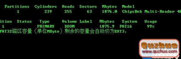一.使用讀卡器給SD卡分區,分一個FAT32格式區和一個EXT3格式區:(此方法適用於WINDOWS XP系統,win7請使用其他磁盤分區工具)