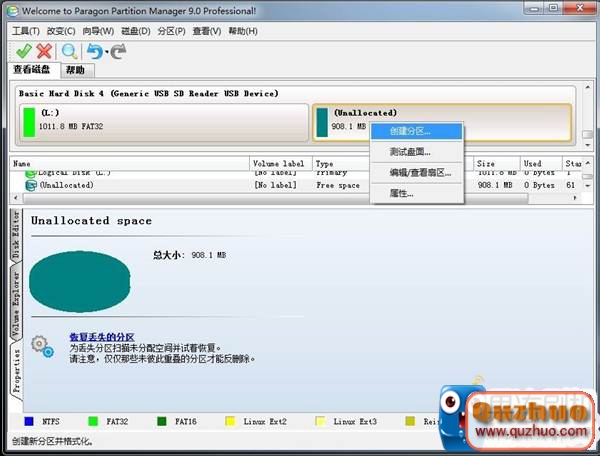 5.右鍵新分出的分區,點擊"創建分區"