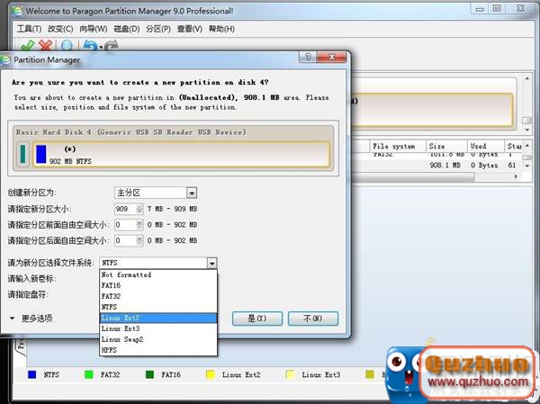 6.出現新界面後,選擇"主分區"-"EXT2分區格式"。這裡千萬別錯了,其它不用動...。點確定繼續操作