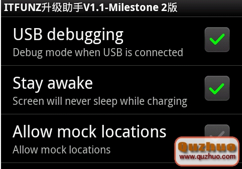 接下來安裝itfunz升級助手,把下載的ITFUNZ升級助手DEFY版V2.0.apk復制到SD卡,之後打開QuickOffice,然後選灰色就是以後再注冊----選SD卡----選itfunz升級助手這時打開後會跳到另一個頁面。會彈出個窗口,點擊settings,最上面那個Unknown sources打鉤,然後再倒數第二個點擊進去打USB和stay打鉤如圖