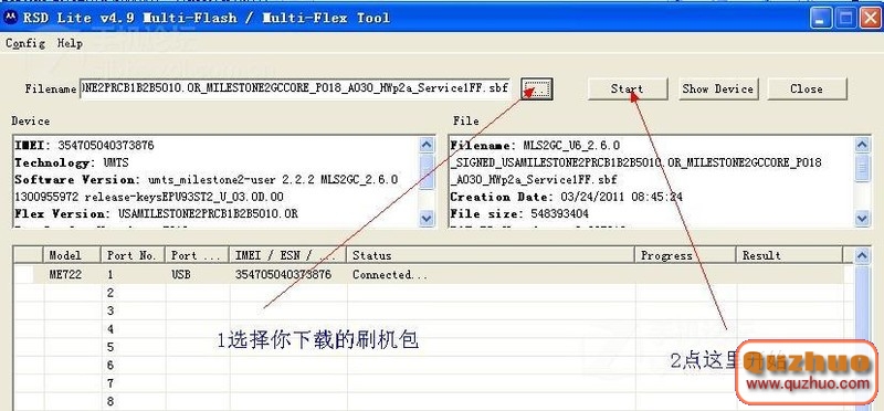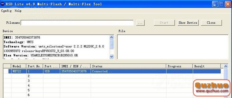 3、將手機插上USB數據線連到www.shuleba.com電腦上,打開RSD4.9,www.shuleba.com電腦會識別出裡程碑2手機的各種設備並自動安裝驅動,最後RSD Lite軟件會顯示出1號USB端口的設備Connected,如下圖: