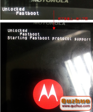 手機完全關機,按音量下鍵和開機鍵,直至出現fastboot字樣,松手,接著按音量上鍵,看到屏幕上方變成第二行出現Starting Fastboot protocol support字樣