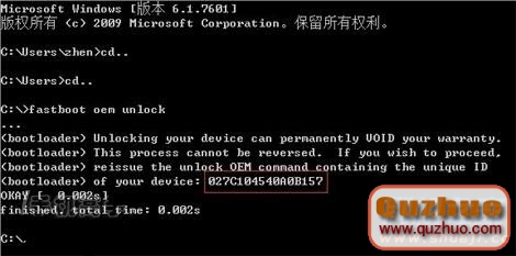 注意紅框處會出現16位數字和字母組成的碼!然後在C:>後面輸入fastboot oem unlock 紅框處出現的16位碼 回車,出現下圖: