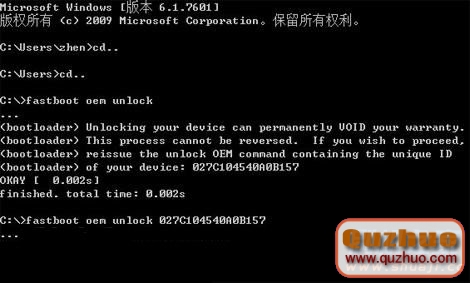 在C:>處輸入fastboot oem unlock回車,出現下圖: