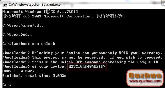注意紅框處會出現16位數字和字母組成的碼!然後在C:\>後面輸入fastboot oem unlock 紅框處出現的16位碼 回車,出現下圖: