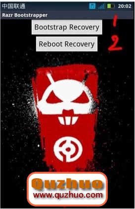 2,在手機上安裝並運行RAZRBootstrap.apk,在bootstrap界面中先點擊Bootstrap Recovery,彈出的權限提示點確認。出現一個確認框之後再點OK。然後點擊Reboot Recovery即可進入Bootstrap的recovery界面。此界面下音量上和音量下移動光標,power鍵確認。