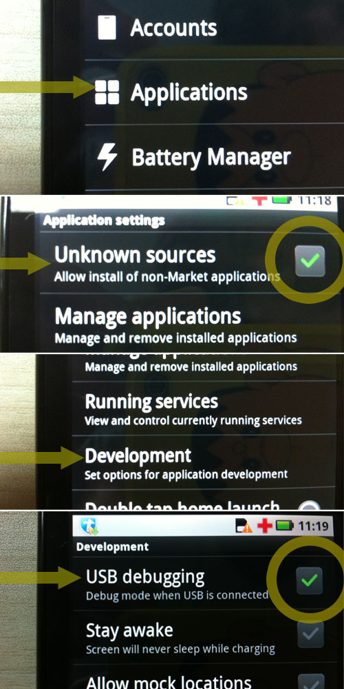 設置setting——應用程序applications開發Development——USB調試USB debugging√;