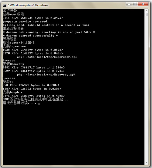 打開桌面刷機工具包OneClickRoot+Recovery目錄下root.bat,等待完成後手機會自動重啟。