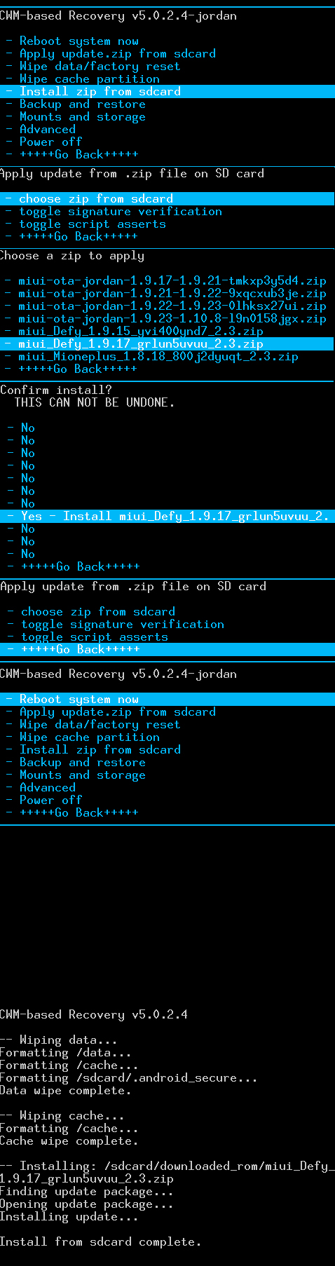 使用Recovery將MIUI ROM刷入手機!確保手機已經進入Recovery菜單。手動進入方法,開機亮藍燈的瞬間按音量下鍵進入。