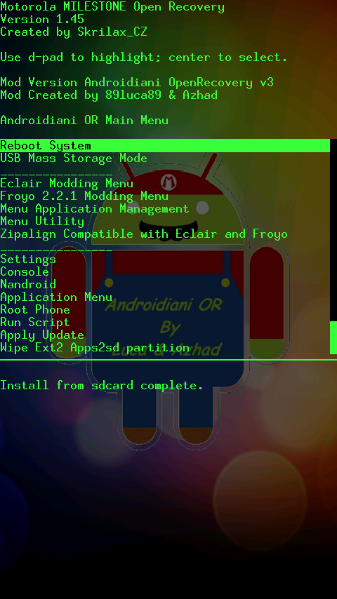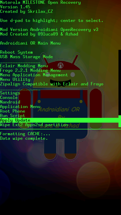 3、關機,進入recovery,執行兩個wipe選項後再執行apply sdcard:update.zip,稍等片刻,可見到如下或類似界面