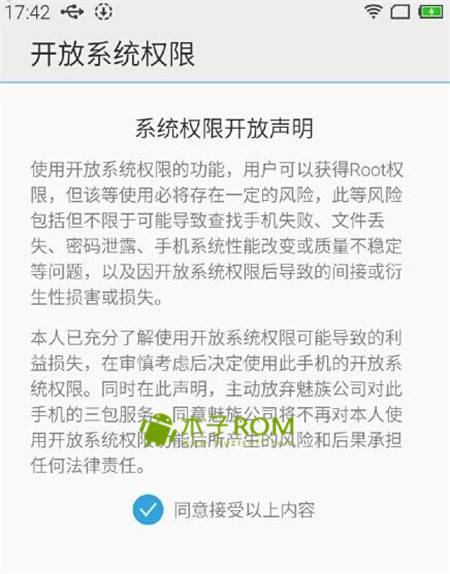 4 接下來就會看到繁瑣的系統權限開放聲明,當然我們果斷是打上勾勾,點確定,就會提交到服務器。當服務器接收到魅族MX4的ROOT申請,就會反饋回到手機。